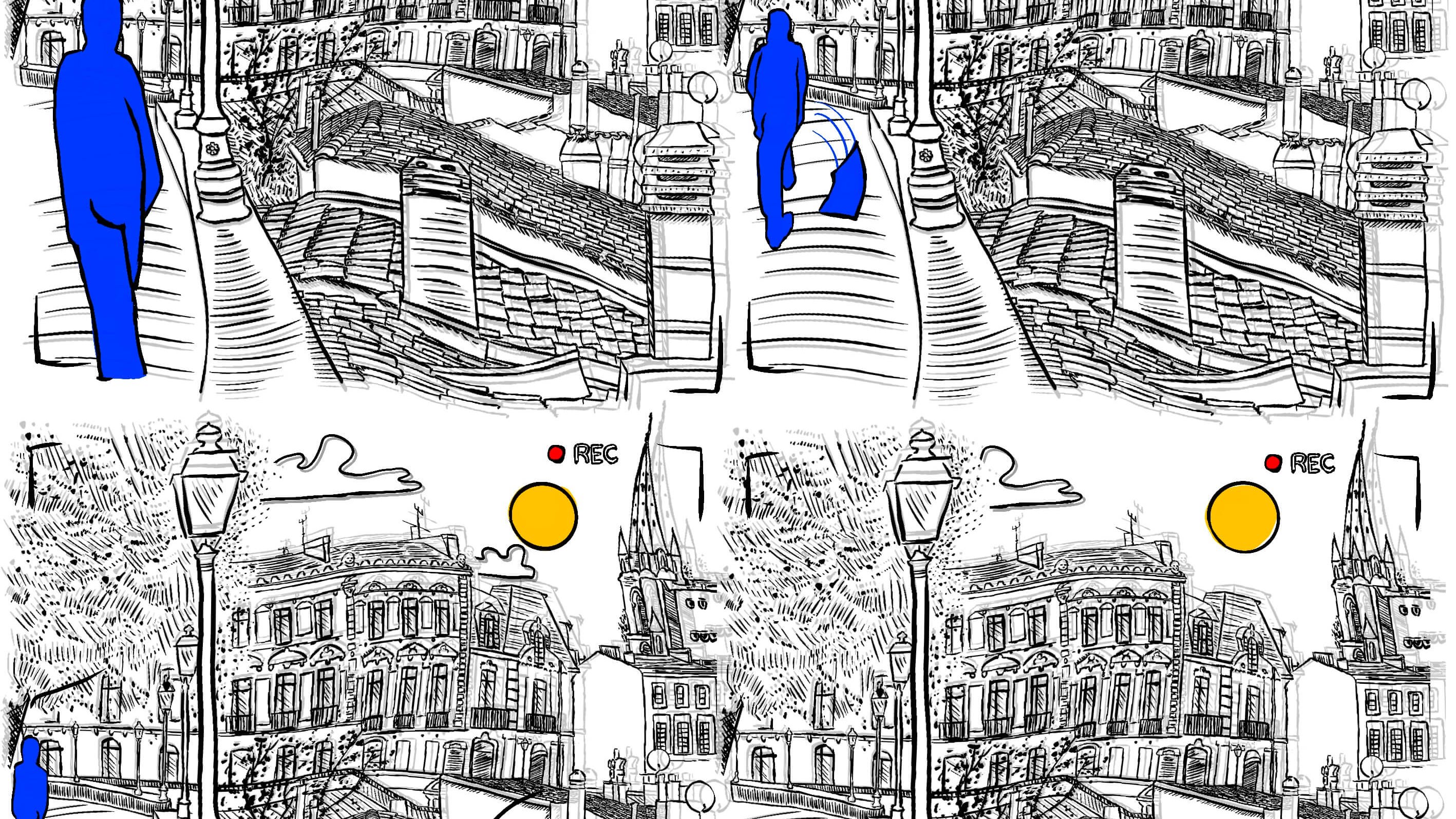 Through the eyes of a surveillance camera, we see, little thumbs leave their marks on their way.