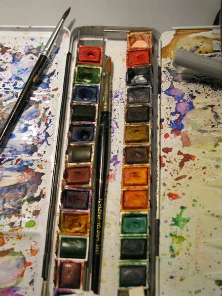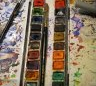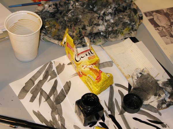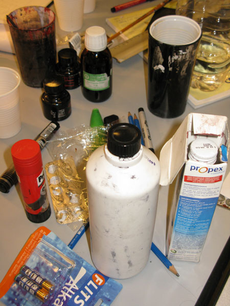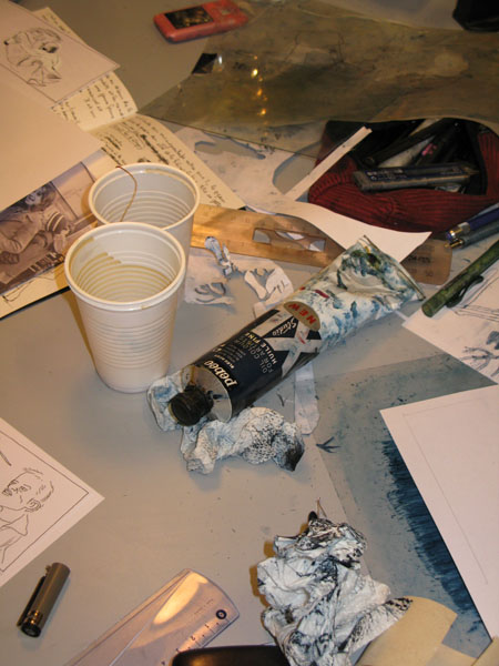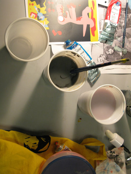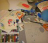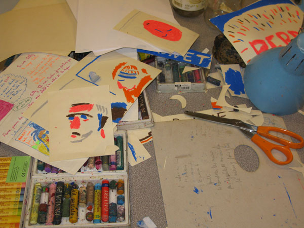 Des tables,des tables,des tables et puis des pinceaux,de la peinture,de la couleur,des ciseaux,et de la peinture et de vieux mouchoirs dégueulasses,remplis de peinture et de morve,de peinture,et des gobelets remplis de peinture,en veux-tu en voilà,et puis des biscuits.
